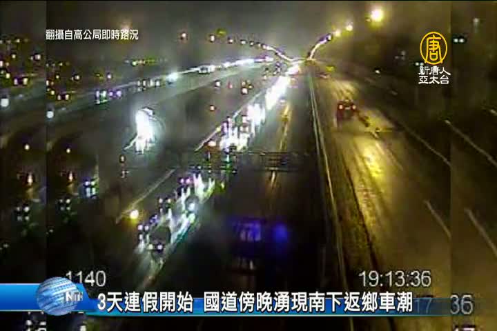 【新唐人亞太台 2017 年 12 月 29 日訊】新聞首先來看到,明天開始,就是跨年3天連續假期,國道在今天下午5點過後,已出現第一波南下返鄉車潮。高公局表示,傍晚除了國道1號竹北-新竹系統路段壅塞,時速不到40公里外,其餘壅塞主要是一般下班車潮,都出現在都會區附近。高公局預估,明天連假首日,全線車流量大約是平常日的1.4倍。國道5號上午7點到中午12點,將實施高乘載管制;在連假期間,國道將採單一費率。每天午夜12點到清晨5點,國道全線雙向會暫停收費。