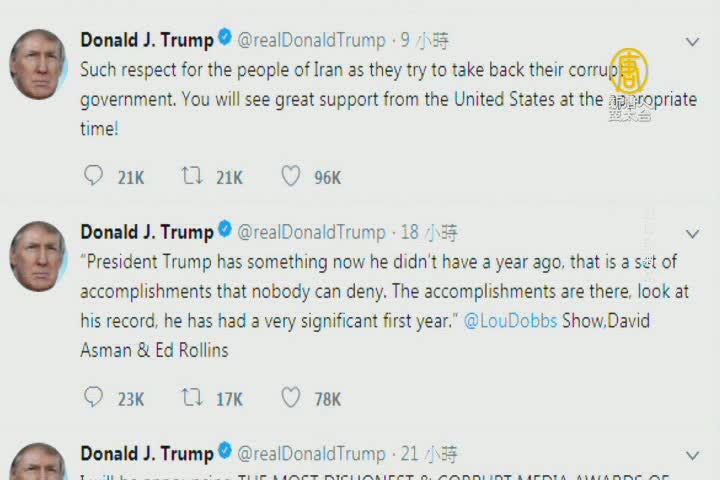 【新唐人亞太台 2018 年 01 月 04 日訊】早安新唐人,先帶您關心,伊朗民眾連日來持續抗爭,反對政府貪腐、物價飛漲。美國總統川普,今天在推文中說。「伊朗人民試圖收回他們貪腐的政府,我們非常敬佩。你們將見到美國在適當的時機提供的巨大支持。」伊朗抗爭,從上週四開始爆發,至今造成至少21人死亡、數百人遭逮捕。