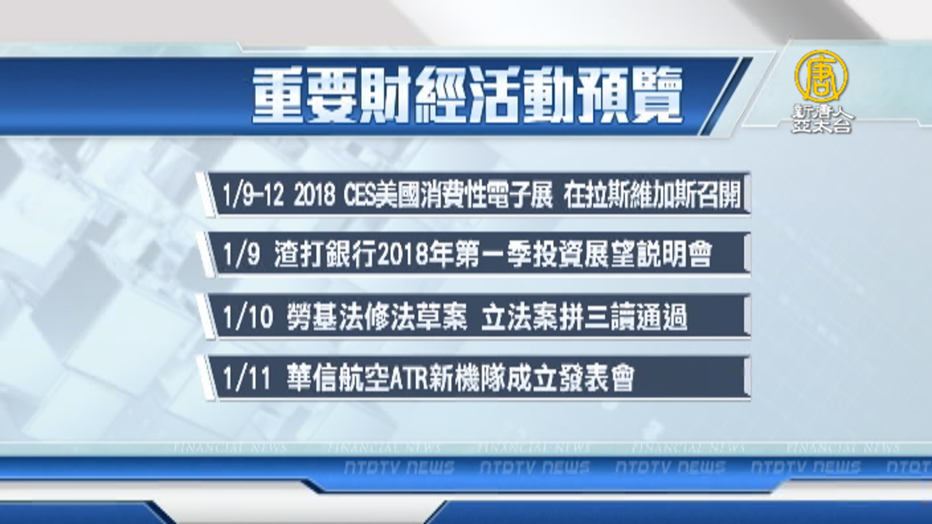【新唐人亞太台 2018 年 01 月 06 日訊】帶您看到下週,有哪些重要的財經活動。