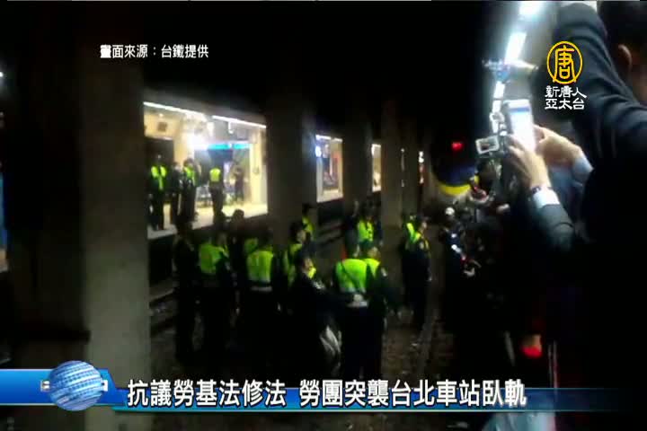 【新唐人亞太台 2018 年 01 月 08 日訊】再來看到稍早的最新消息,就在立法院臨時會,還在協商《勞基法》修正草案的同時,晚間桃園市產業總工會突襲北車,發起臥軌抗議。勞團抗議團體約15人左右,到台北車站月台進行臥軌抗議行動,隨後被警方拉起,月台聚集近百位警察,現場爆發嚴重推擠。勞團表示,臥軌不是要影響旅客通勤族,許多勞工都加班到深夜,這些事情必須被改變,才站出來臥軌抗爭。不過松山到萬華站,各式南下北上列車,目前都受到延誤。