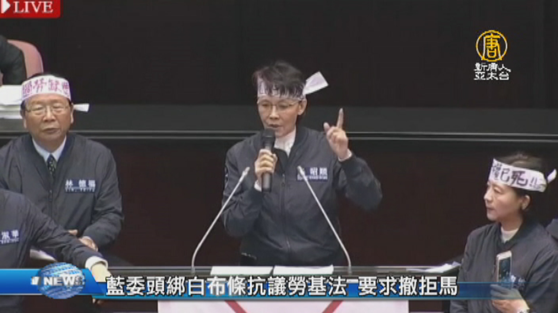 【新唐人亞太台 2018 年 01 月 09 日訊】立法院今天繼續審查勞基法,國民黨揚言全力阻擋,不排除用大量提案杯葛修法。剛剛全體藍委也頭綁白布條在議場內抗議。