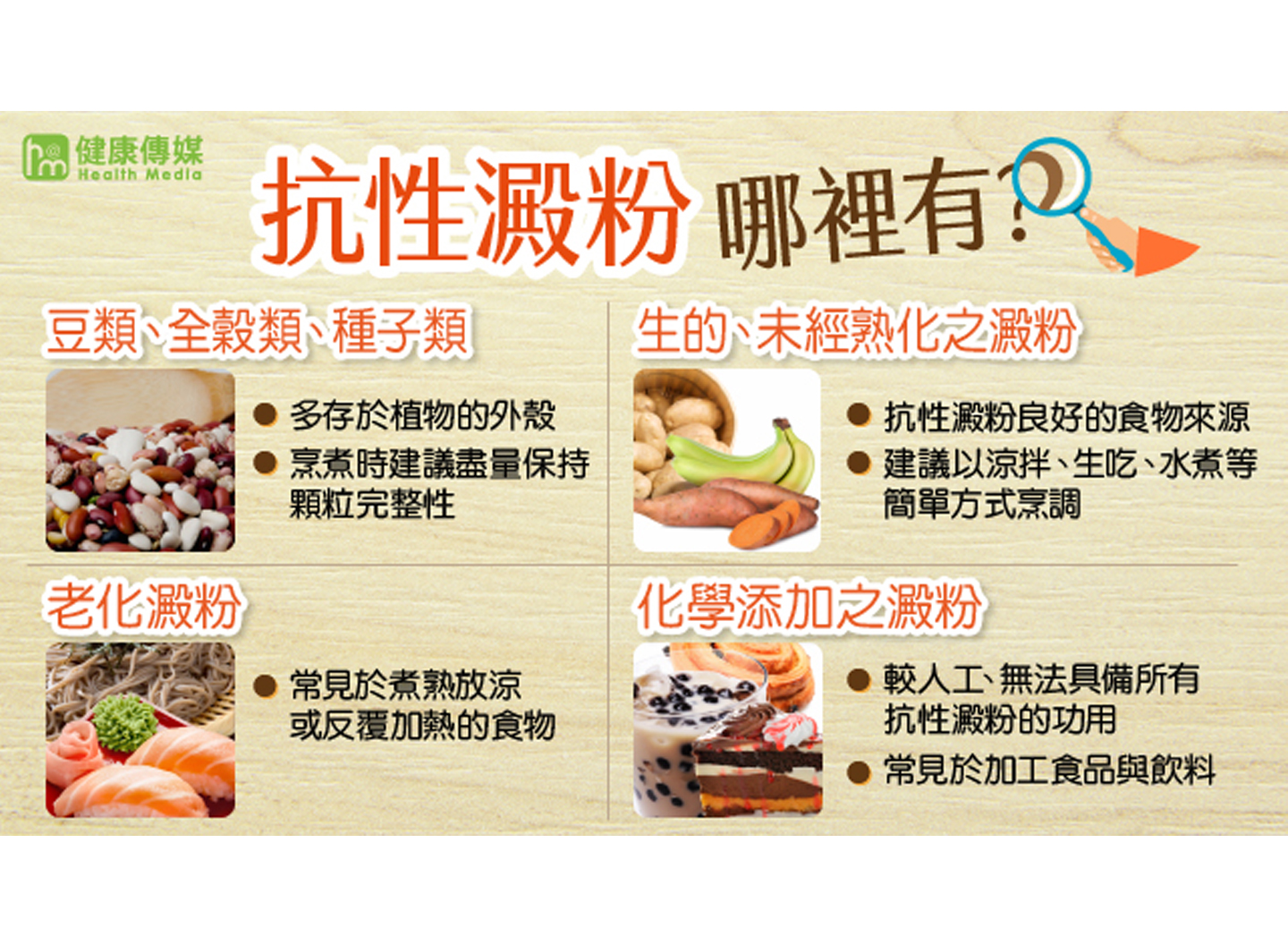 至於建議的食用量,李婉萍表示,目前抗性澱粉沒有一個明確的建議食用量,但因抗性澱粉與膳食纖維性質相似,而膳食纖維一般會建議一天可食用25到35公克,因此抗性澱粉也可用這個數值作為食用參考依據。而日常飲食中常見的抗性澱粉,大致可分為4類: