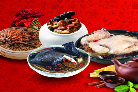 量販店客服經理親自率領主廚端上一盤盤年菜,包括鹿茸冬蟲烏骨雞、干貝櫻花蝦米糕、義美百匯羹、五更腸旺等12道料理,讓人看了垂涎三尺!