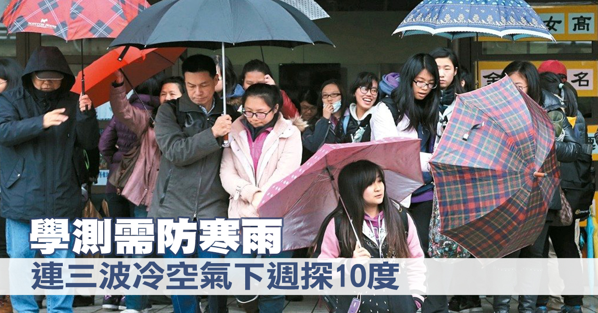 2017-01-20 21:40:07大學學測今天(20日)登場,第一天上午考國文、下午是數學跟社會,但是受到強烈大陸冷氣團影響,全台清晨冷颼颼,低溫只有11、12度,有不少考生戴口罩、圍巾、傳統暖暖包等禦寒物品應考。