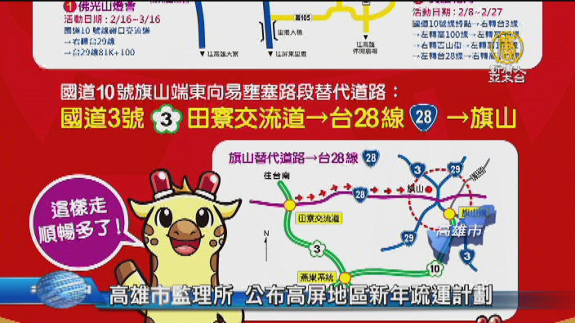 【新唐人亞太台 2018 年 01 月 26 日訊】中國新年六天連假即將來臨,各大旅遊景點將湧現大量車潮,高雄市監理所今天(26日)舉行高屏地區新年疏運記者會,說明交通疏導計畫及熱門景點的交通改道、接駁等內容,並請用路人多多利用公共運輸工具,減少車流負擔。