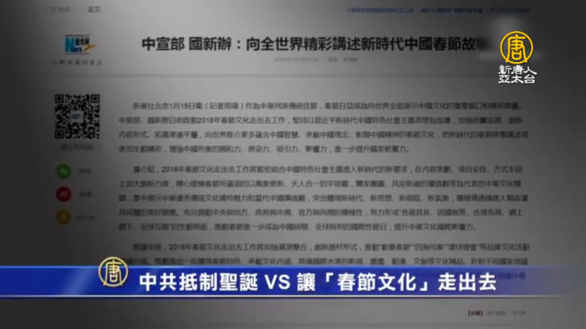 【新唐人亞太台 2018 年 01 月 27 日訊】中共日前啟動所謂的「2018年春節文化走出去」工作,希望讓更多的外國人來過中共所稱的「春節」,但與此同時,它又不准自己的人民過西方節日,尤其是聖誕節,這兩者之間有矛盾嗎?請看報導。