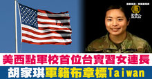 2021-06-08 08:06:29台灣陸軍官校學生胡家琪,現就讀美國西點軍校升四年級,是台灣赴西點軍校的第三名女性官校生。今年夏季新生入伍訓的「野獸營」中,胡家琪擔任實習連長,是台灣首位出任這項職務的台籍西點生。胡家琪還在說明影片中,在迷彩服上的左胸軍籍布章標示「TAIWAN」,而在右臂上佩掛青天白日滿地紅的「中華民國國旗」布章。