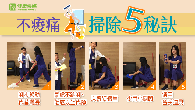 邱正民進一步說明,正確的做法是,掃地、拖地或使用吸塵器時,應多走動,避免彎腰聳肩和駝背姿勢;擦拭高處櫃子時,可使用小凳子墊高,避免踮腳尖及過度抬頭擦拭,低處則以矮凳取代長時間彎腰及蹲的動作,建議操作範圍以胸前至頭部高度,水平則是雙手打開為最大範圍,避免身體過度傾斜延展,造成肌肉拉傷。