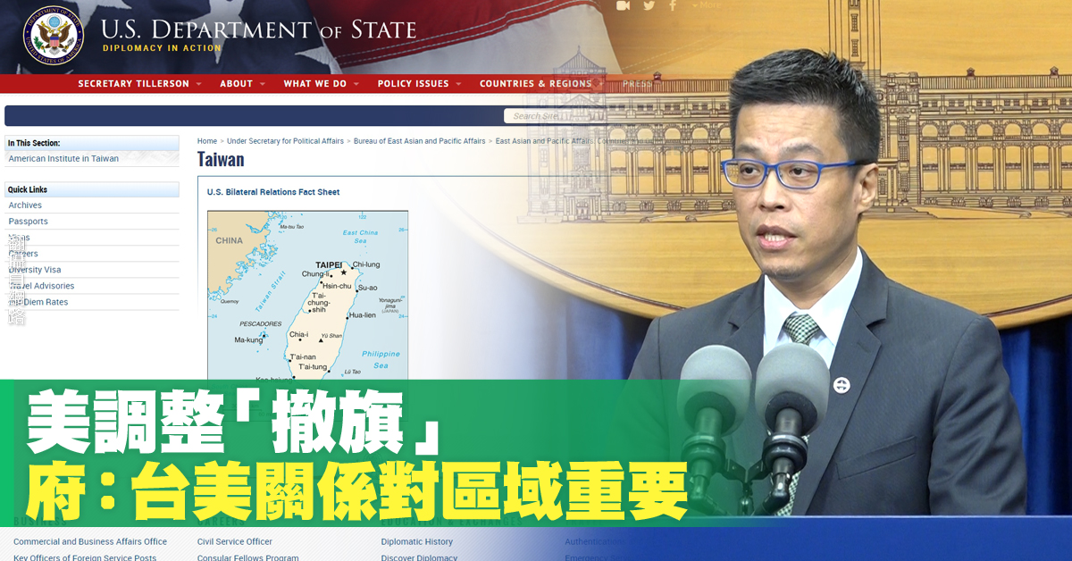 中華民國總統府發言人 黃重諺:「反恐聯盟這部分,原始的網站上應該是沒有撤除的問題。美國國務院領務局這些相關官網的改版,移除各國國旗的情況,我們有注意到。不過我想,總體而言,美國是台灣在國際上最重要的盟友,而東亞地區的和平穩定,包括持續良好的台美關係,對於我國以及區域當中所有國家都至為重要。」