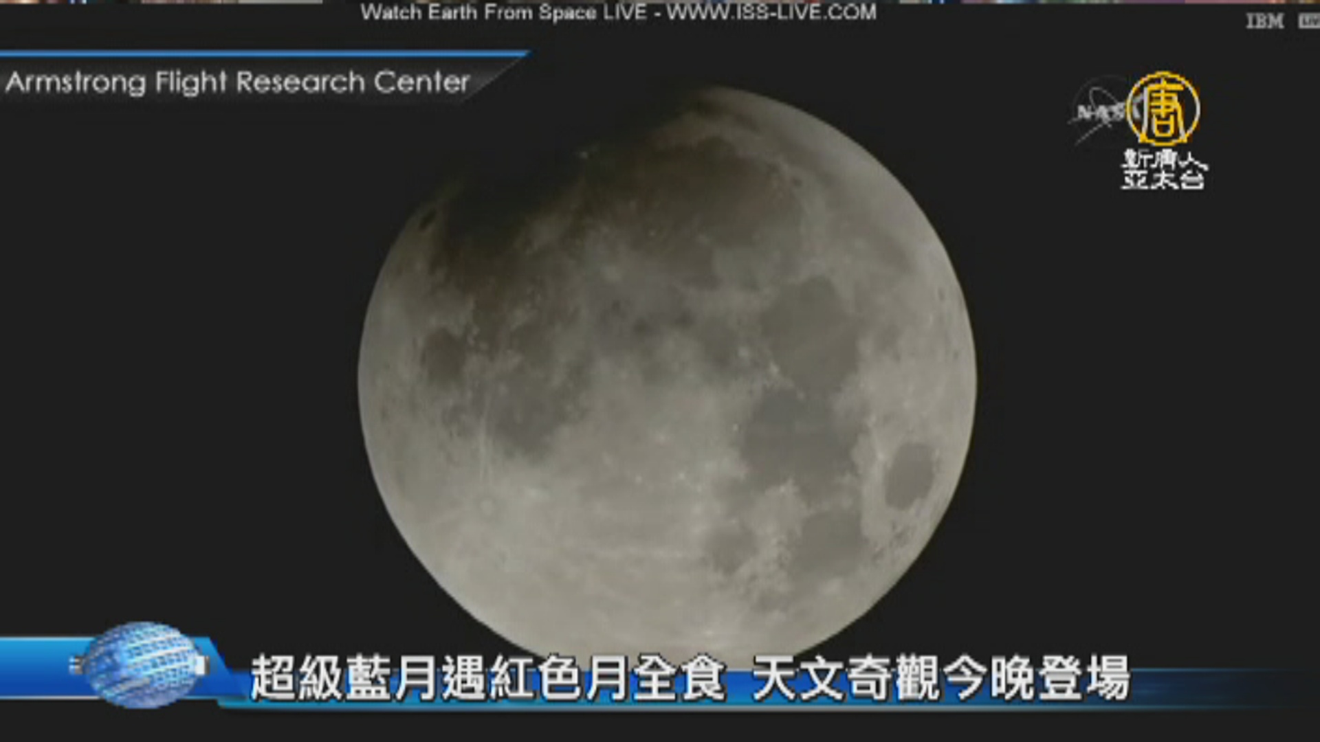 【新唐人亞太台 2018 年 01 月 31 日訊】新聞首先來看到,睽違152年的天文奇觀,「紅色超級藍月」,將在今晚登場。剛剛稍早,7點48分左右已經可以看到初虧現象,一直到今晚11點12分,5個多小時裡,都可以觀賞到紅色月全食現象。而20點51分開始,則進入食既到生光的全食階段,月面整個會呈現紅色,加上今天是一月的第二次月圓「藍月」,又恰逢超級滿月。極為罕見的,「紅色超級藍月」三種奇觀同時出現。如果你在高屏地區,只要在戶外抬頭看天空就能看到,可惜北部地區因為天候不佳,要看到紅色超級月亮,只能上氣象局,天文館,甚至美國NASA,觀看網路直播。