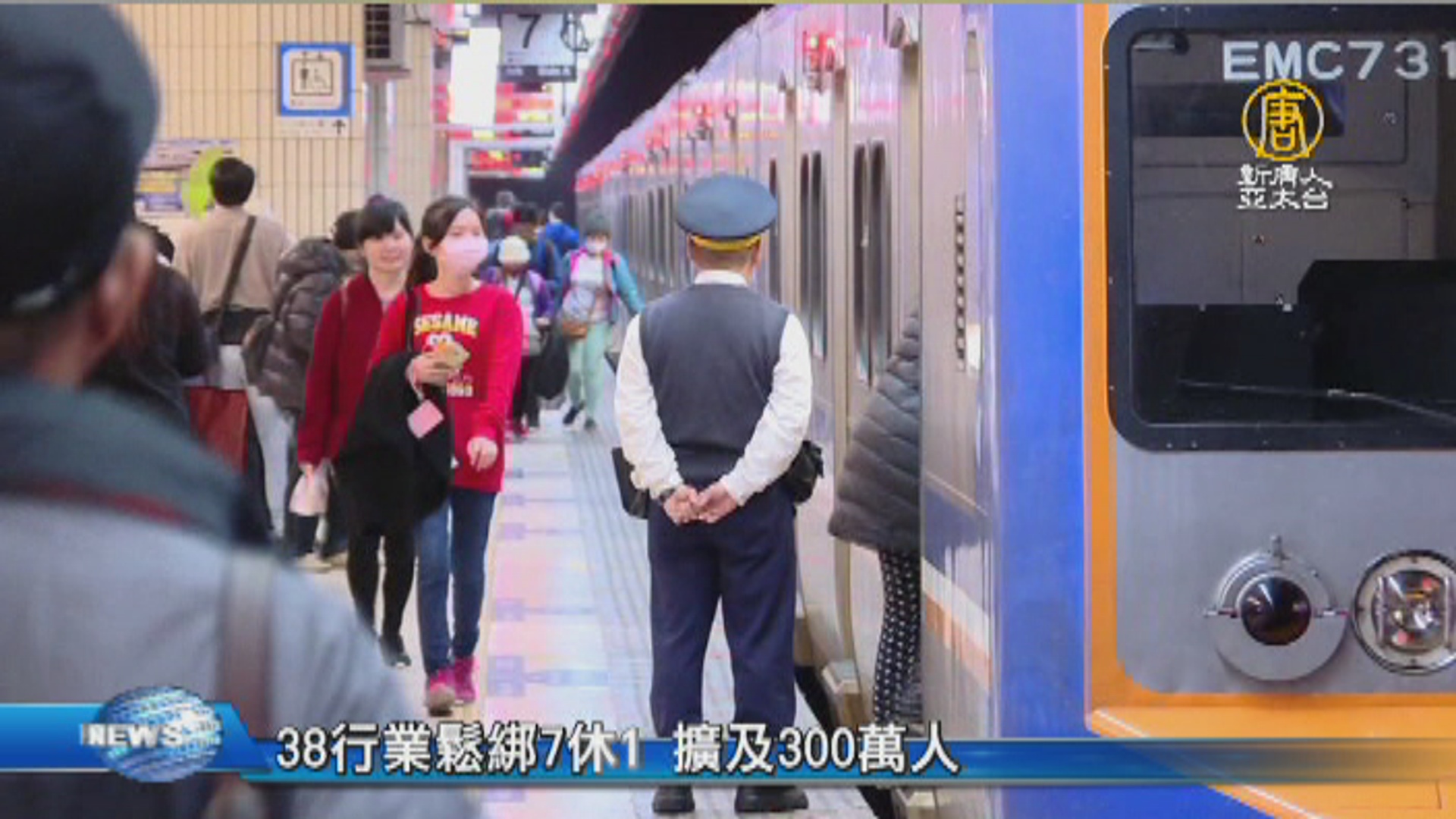 【新唐人亞太台 2018 年 02 月 01 日訊】《勞基法》三讀通過後,勞動部昨天宣布,台鐵、台電、中油、台糖、台水等公司的部分工作者,適用輪班間距縮短到8小時;遊覽車客運業、旅行業等38類行業適用鬆綁7休1。初估影響人次至少涵蓋全台三分之一勞工,超過300萬人。