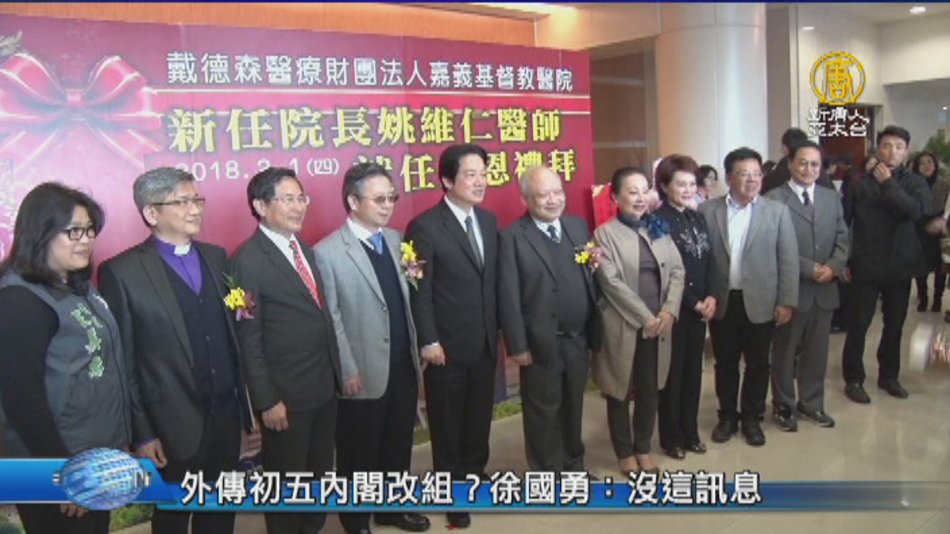 【新唐人亞太台 2018 年 02 月 01 日訊】有媒體報導,外傳過年後,初五當日行政院內閣將改組,由高雄市長陳菊的人馬全面進駐,對此,行政院發言人徐國勇嚴正否認到底,強調沒有這個訊息。