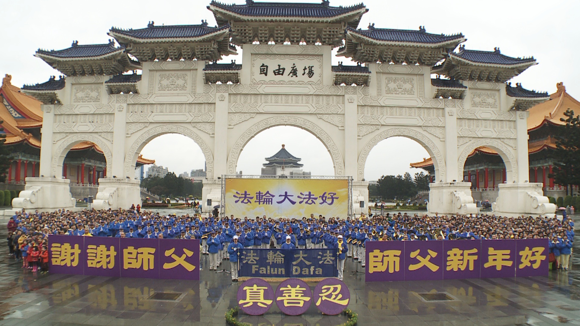 不只有小朋友,800多位居住在台灣北部的法輪功學員,一樣頂著寒風冒著雨,在中國新年前,聚集在台北自由廣場,向法輪功創始人李洪志師父,表達感謝之意,而除了拜年,法輪功學員也利用這難得的機會,向路過的民眾以及遊客,講述法輪功受到中共迫害的事實,讓更多人了解到真相。