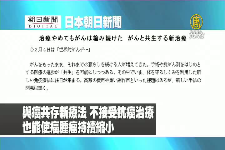 【新唐人亞太台 2018 年 02 月 05 日訊】來看到日本朝日新聞報導:與癌共存的新療法,不接受抗癌治療,也能使癌腫瘤持續縮小。