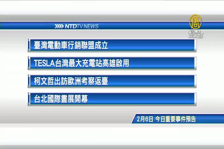 【新唐人亞太台 2018 年 02 月 06 日訊】接著看到,今天, 2月6日,星期二,有哪些重要活動。臺灣電動車行銷聯盟成立。特斯拉台灣最大充電站,今天在高雄啟用。台北市長柯文哲,出訪歐洲考察,今天返臺。最後是,台北國際書展,今天開幕。