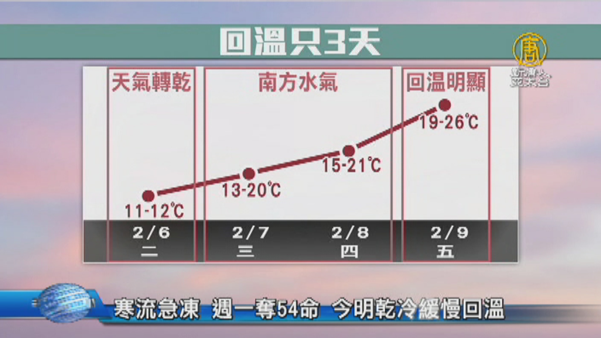 【新唐人亞太台 2018 年 02 月 06 日訊】再來看到,這一次寒流一連凍了5天,昨天(2月5日)一天就傳出54人猝死,還好今明兩天開始轉乾,但未來這幾天,氣溫會小幅回升,到了星期五,白天更一口氣回溫到26度,但是要提醒,週六(10日)又有一波寒流要報到!
