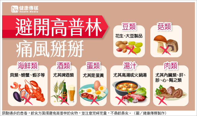 陳稼洺提醒,尿酸過多的患者,飲食方面須避免高普林(purine)的食物,如海鮮類的牡蠣、貝類、螃蟹、蝦子、墨魚等,還有香菇、蛋黃、肉類的內臟、啤酒等酒精類,及豆類如花生、大豆製品等,另外還有像是高湯、火鍋湯也都要盡量避免。