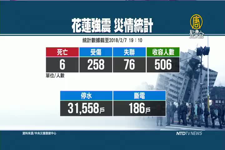 【新唐人亞太台 2018 年 02 月 07 日訊】好,花蓮前夜強震後,市區出現大樓倒塌、路面龜裂狀況,經過一天一夜,死傷人數還在不斷更新,來看到截至晚間七點十分,官方的最新災情彙整。