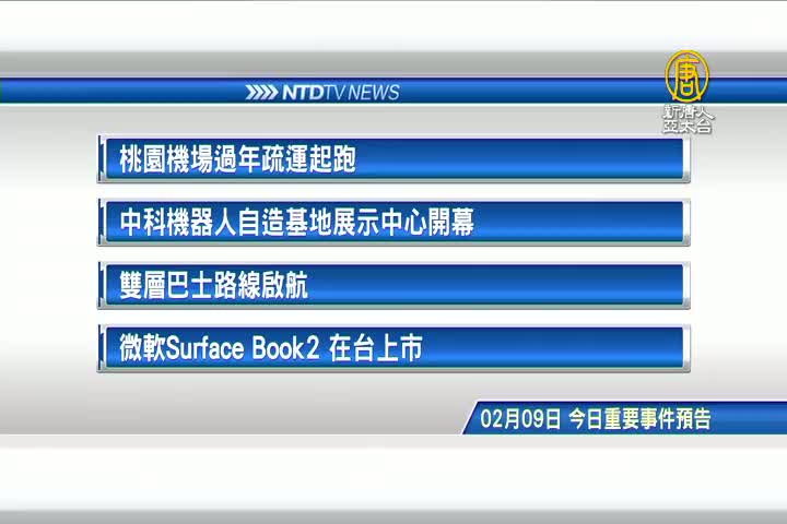 【新唐人亞太台 2018 年 02 月 09 日訊】接著看到,今天,2月9日,星期五 ,有哪些重要活動。首先是,民生消息,桃園機場過年疏運起跑,從今天到28日,將增加一千多架次加班機。再來是,中科機器人自造基地展示中心開幕。台南雙層巴士路線啟航。最後是,微軟Surface Book2 在台上市。