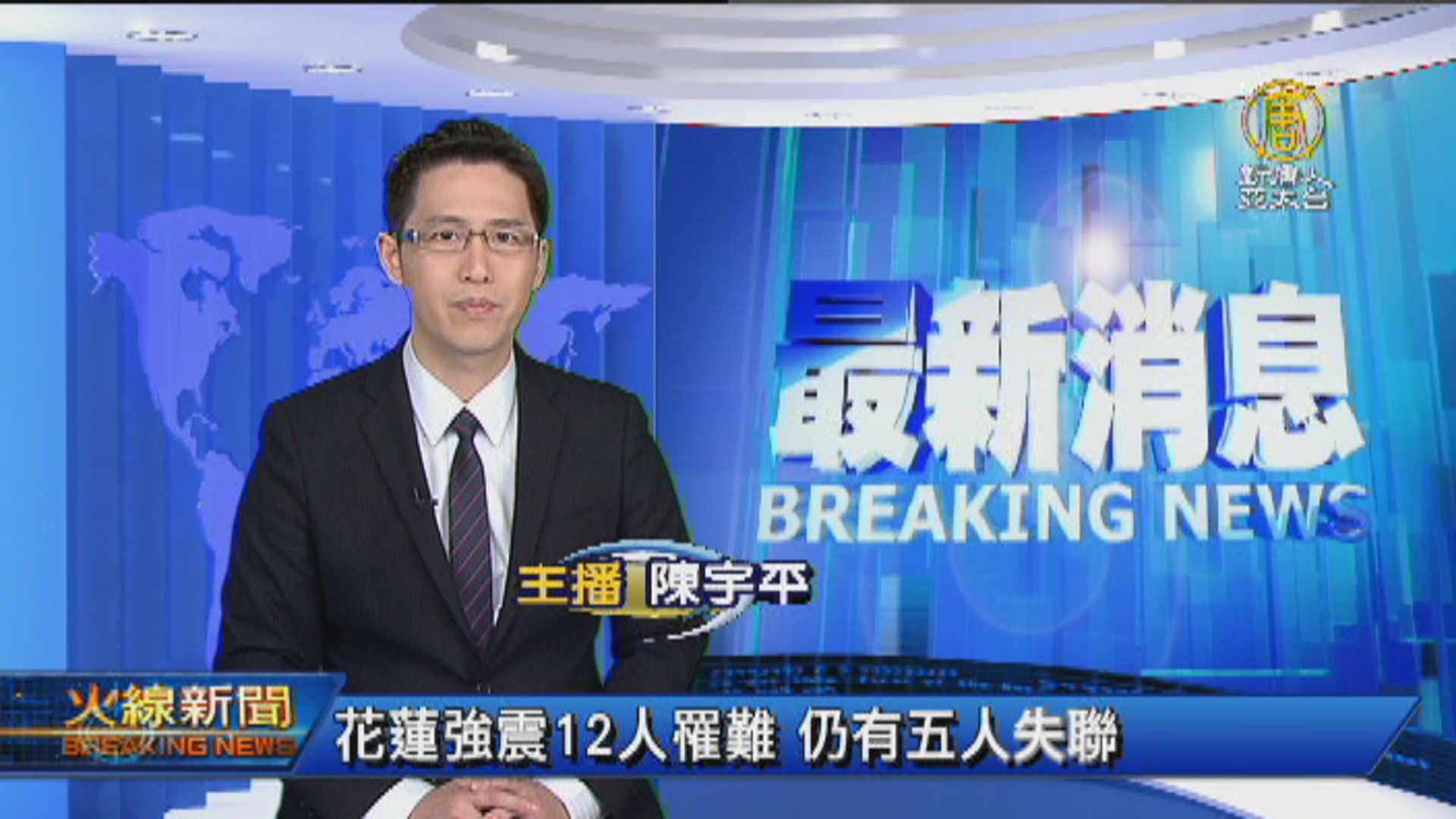 【新唐人亞太台 2018 年 02 月 09 日訊】新聞首先來看到,花蓮強震搜救進入第三天,今晚黃金72小時時間就要過去,但截止至9日晚間7點,雲翠大樓內,仍有5人失聯。罹難人數來到12人,包含雲翠9人,統帥大飯店一1人,自宅2人,另外受傷人數為278人,目前獲得收容的民眾有727位。有8100戶,因自來水管線受餘震波及,出現破裂情況,目前停水搶修。交通方面,花蓮港有三座受損碼頭維修中。各層級學校195所財損高達1億2520多萬。