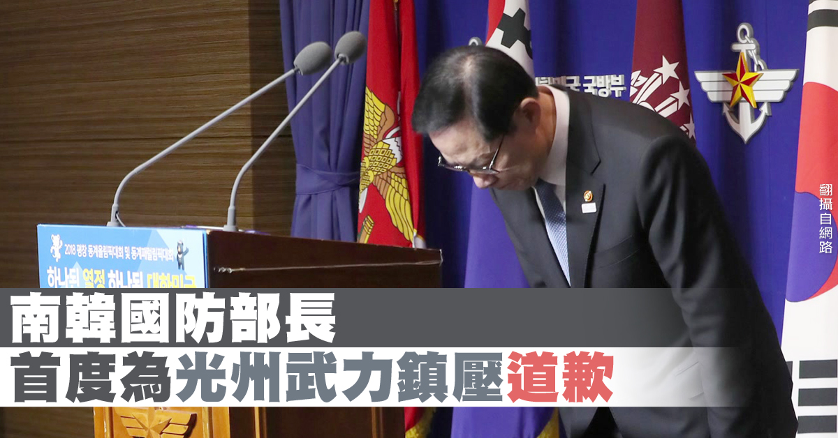 風靡兩岸的韓國電影「我只是個計程車司機」,描述1980年以武力鎮壓光州民主運動,周五(9日),南韓國防部首度公開道歉,國防部長宋永武發表聲明,指「作為國防部長,我為軍隊在38年前的5月18日,向於民主運動中受害的民眾帶來痛苦作出真誠致歉和慰問」,也坦言會採取措施防範事件再次發生。