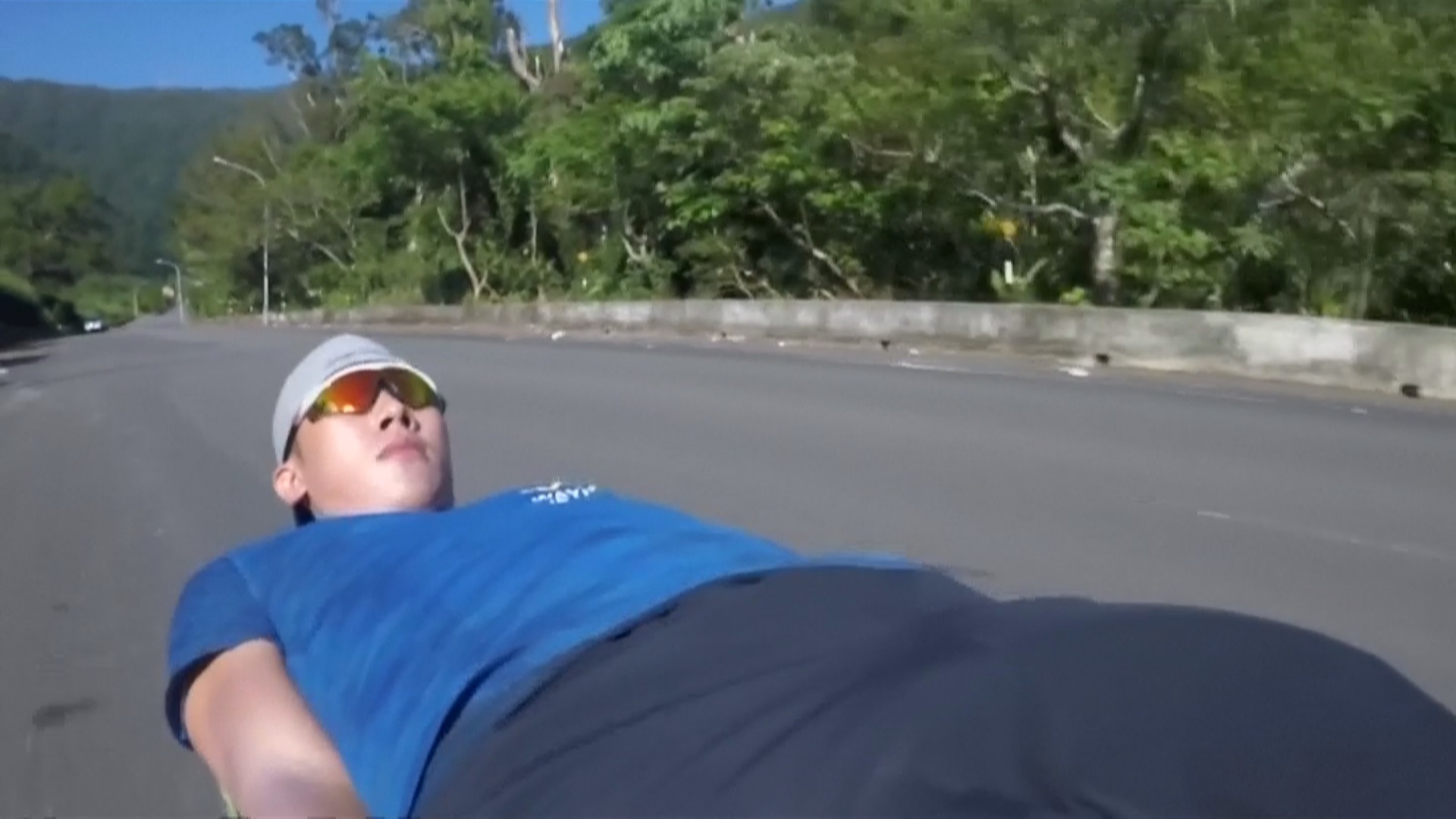 在豔陽下,連德安在台灣宜蘭山坡路段乘著雪橇,來來回回的練習,雖然沒有冰、沒有雪,但只要把雪橇的冰刀換成輪子,一樣可以訓練,最高時速可達105公里。