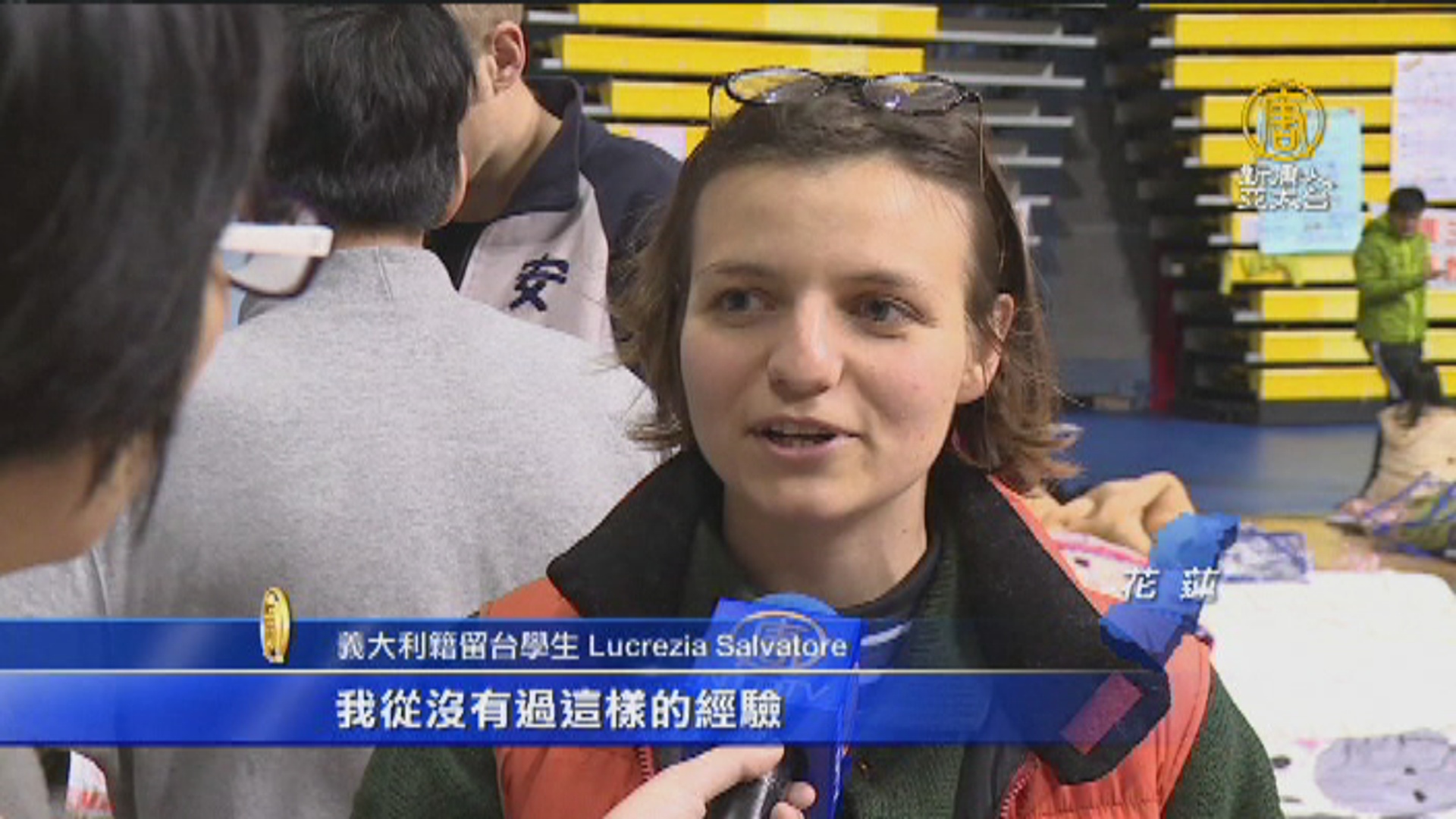 義大利籍留台學生 Lucrezia Salvatore:「當我下樓時,雖然人們都很害怕但他們仍向我微笑。他們告訴我別擔心,沒事的。因為你不是一個人,外面有很多人能幫你。當時有很多人幫助我,真得很棒。身邊的人讓我感到安全,有家的感覺,感覺很溫馨。」