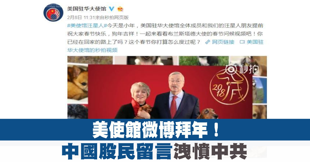 帶著妻子與愛犬,喜氣洋洋與中國民眾拜年,美國駐中國大使 布蘭斯塔德的拜年,湧入大量留言。但來源是,上週剛遭遇股市下跌的中國股民,內容都在表達,對中國股市的不滿。