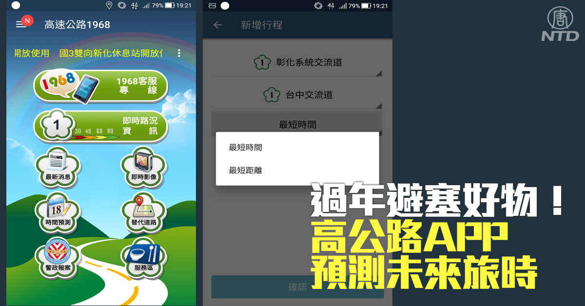 【新唐人亞太台 2018 年 02 月 14 日訊】小年夜,返鄉車潮開始湧現,高速公路1968App,即日起增加新功能,可以查詢預測未來的旅行時間,民眾可以規劃避開壅塞時段。目前可查詢的路線,包括國道1號、3號、5號,只要選擇兩個交流道之間的路徑,填入出發時間,就會顯示前後一兩個小時的預估旅程時間。今天Android版APP先上線,蘋果iOS版本通過審核後才會上架。不過高公路局提醒,汽車駕駛人開車時不要自己操作,以免危險,也會被處罰。