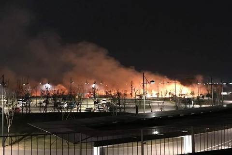【新唐人亞太台 2018 年 02 月 17 日訊】2018台灣燈會嘉義燈會昨晚正式點燈,今晚(17日)8點多施放煙火時,卻不慎引發雜草火警,火勢一路延燒至故宮南院北側甘蔗園,在黑夜中竄出熊熊大火,嘉義縣消防局出動消防車搶救。火勢在8點52分獲得控制,並於9點10分撲滅。