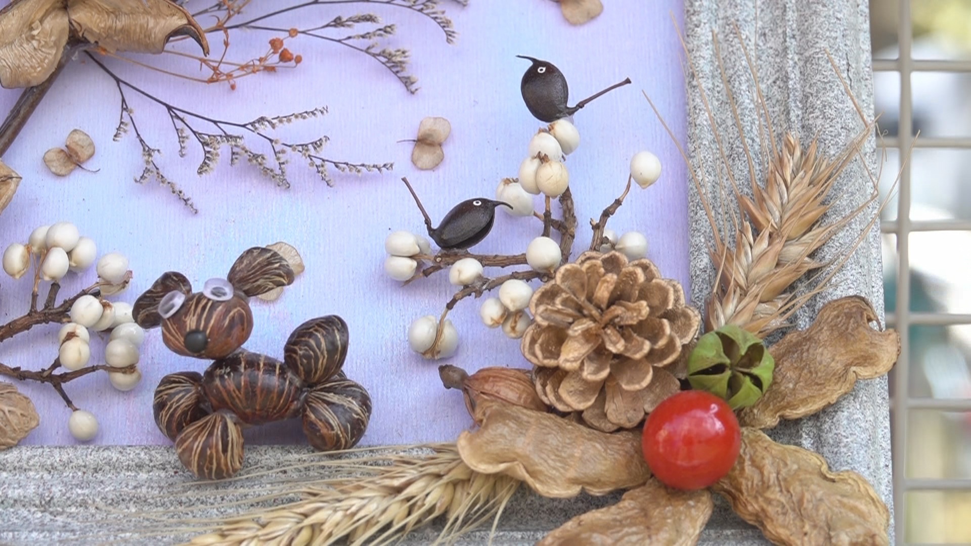 取名「花開富貴」的種子文創作品,用二天時間把銀樺的種子,和木玫瑰搭配成一幅畫,還有造型精緻的種子筆筒。