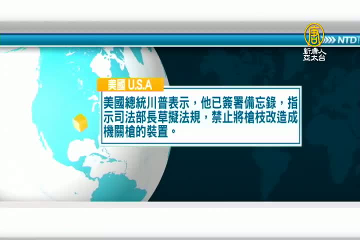 美國總統川普表示,他已簽署備忘錄,指示司法部長草擬法規,禁止將槍枝改造成機關槍的裝置。