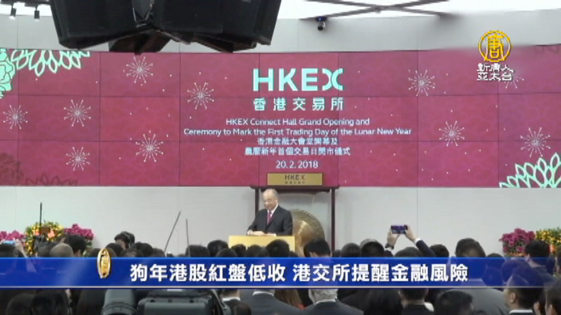 【新唐人亞太台 2018 年 02 月 21 日訊】再來鏡頭轉到香港,港股雞年表現不錯,那麼迎接狗年,今天第一個交易日,重新站上三萬一千點大關。港交所主席周松崗表示,過去幾週股市波幅大,提醒投資要注意風險。
