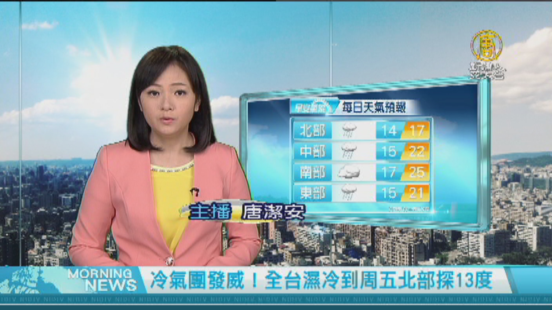 【新唐人亞太台 2018 年 02 月 22 日訊】歡迎您收看2月22日的早安新唐人,我是唐潔安。先來帶您關心今天的天氣情況。今天冷氣團發威,氣溫溜滑梯,北部低溫下探13度,伴隨降雨,感覺上會更加濕冷,玉山甚至有降雪機會,而這波冷氣團,預計要到週五白天,雨勢才會趨緩,氣溫也可稍微回溫,但緊接著,下周又會有另一波冷氣團報到。帶您一起來看到國際媒體重要訊息。
