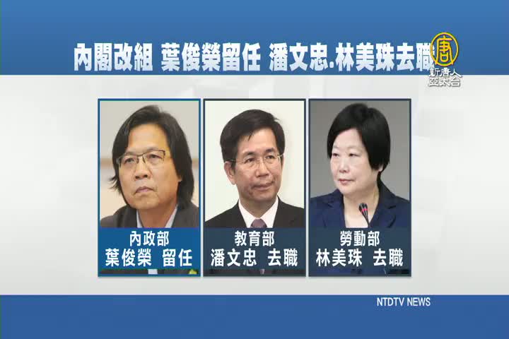 【新唐人亞太台 2018 年 02 月 22 日訊】好,府院調整腳步再出發,確定改組內閣人事。這波調整,預計最快明天或下週一宣布。行政院長賴清德今天記者會上,不願透露細節。據了解,內政部長葉俊榮確定留任,但介入台大校長遴選的教育部長潘文忠,已向高層表達辭意,將會去職。而勞動部長林美珠,則因身體因素,想好好休息,部長一職可能由勞動部次長蘇麗瓊扶正。