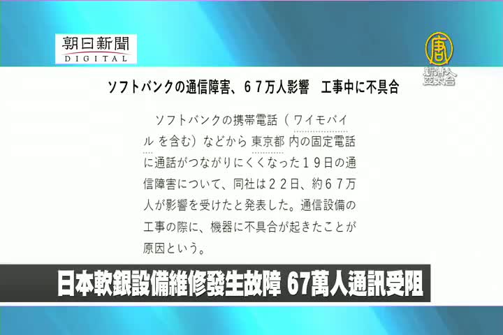 【新唐人亞太台 2018 年 02 月 23 日訊】來看到日本朝日新聞報導:日本軟銀在設備維修時發生故障,造成67萬人通訊受阻。
