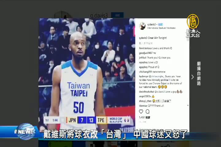 【新唐人亞太台 2018 年 02 月 23 日訊】再來看到,世界盃男籃亞洲區資格賽,台灣隊昨天以 70:69險勝日本,漂亮奪下首勝。賽後「抗日英雄」戴維斯,在社群網站將球衣上的「Chinese」改成「Taiwan」,讓我國球迷大讚「好感人」,也有不少人認為台灣隊真的是撿到寶。但此舉,卻被轉貼到中國天涯論壇,讓許多中國網友,相當不滿。