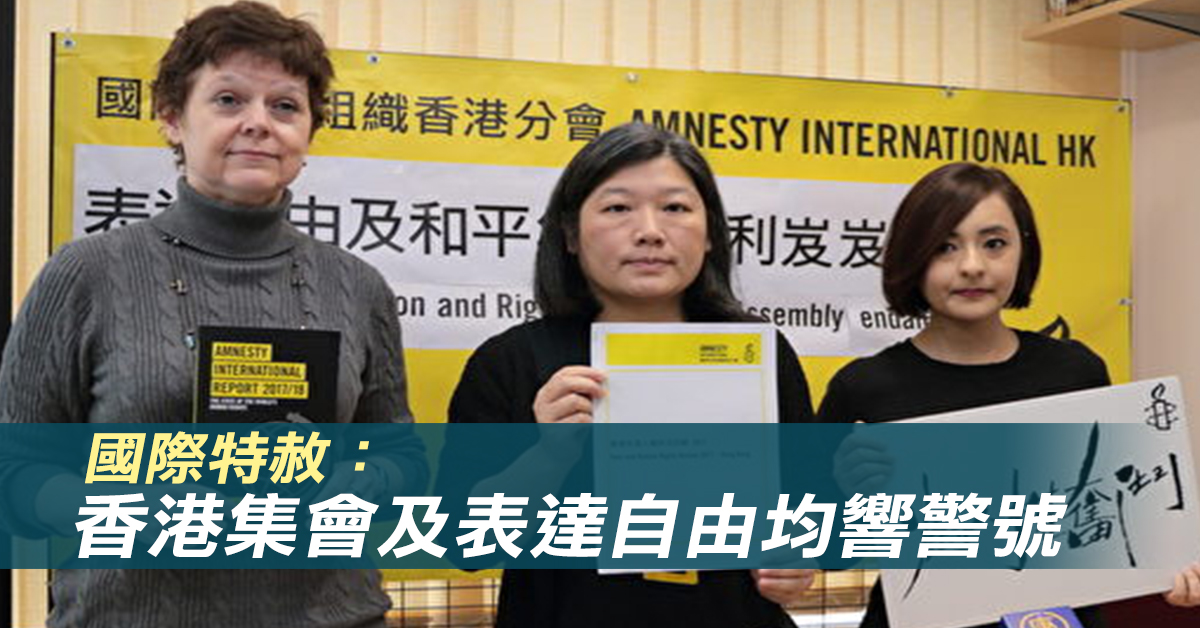國際特赦組織香港分會,發表《香港年度人權狀況回顧》,指香港2017年的和平集會和表達自由的權利,都響起警號,香港的處境越來越不理想。組織批評港府的政治檢控製造寒蟬效應,又關注《國歌法》可能影響港人表達自由。