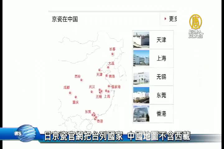 【新唐人亞太台 2018 年 02 月 26 日訊】歡迎回來。有網友24日發現,日本京瓷集團 的中文官網,在顯示分店的中國地圖中,少了西藏、新疆、海南、內蒙古、廣西、寧夏等中國自治區,隔天(25日),京瓷緊急發公告表示,已刪除相關內容並誠摯致歉。不過,目前留存的「京瓷在中國」營銷地點中,依舊沒有包括台灣,台灣也還是與新加坡、泰國、越南等國家同樣並列在亞太地區中。
