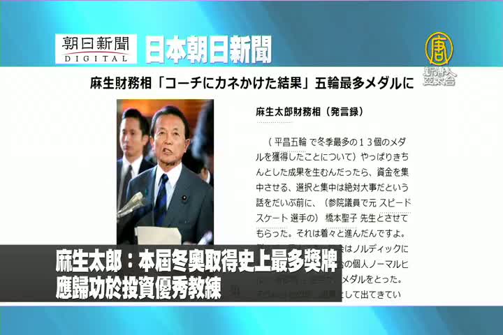 【新唐人亞太台 2018 年 02 月 28 日訊】來看到日本朝日新聞報導:日本財務大臣麻生太郎表示,本屆冬奧取得日本史上最多獎牌,應歸功於投資聘請優秀教練。
