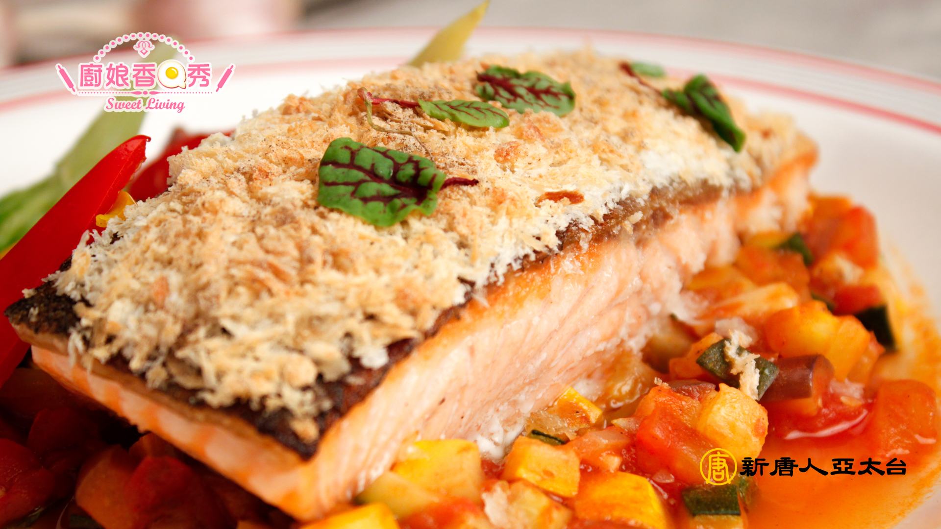 食材:鮭魚(40克)麵包粉(12克)蒜頭(6克)胡椒鹽(2克)黃綠櫛瓜(30克)蕃茄糊(7克)洋蔥(8克)花椰菜(6克)番茄糊(7克)時蔬、橄欖油適量