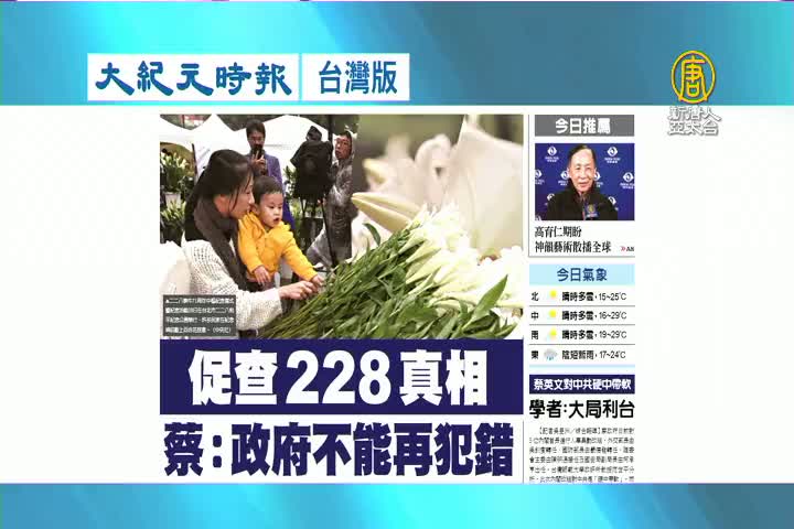 【新唐人亞太台 2018 年 03 月 01 日訊】繼續看到大紀元時報台灣版報導:總統蔡英文敦促調查228真相,並對此表示,政府不能再犯錯。