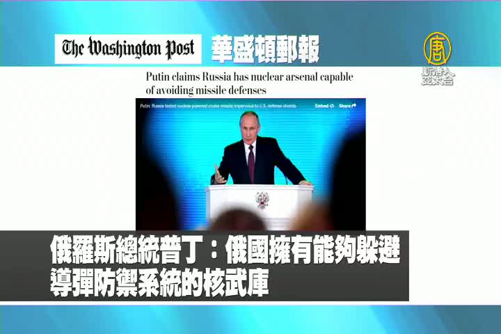 【新唐人亞太台 2018 年 03 月 02 日訊】首先來看到美國華盛頓郵報報導:俄羅斯總統普丁表示,俄國擁有能夠躲避導彈防禦系統的核武庫。