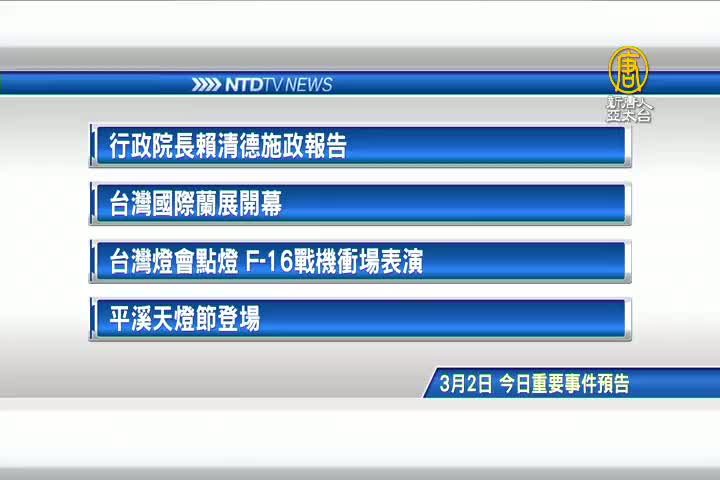 【新唐人亞太台 2018 年 03 月 02 日訊】接著看到,今天,3月2日,星期五 ,有哪些重要活動。首先是,行政院長賴清德今天進行施政報告。再來是,台灣國際蘭展開幕。另外,今天是元宵節,台灣燈會點燈,F-16戰機將衝場表演。以及,平溪天燈節登場。