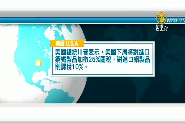 美國總統川普表示,美國下周將對進口鋼鐵製品加徵25%關稅,對進口鋁製品則課稅10%。