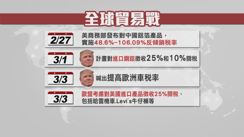 從2月27號美國商務部發布對中國鋁箔產品,實施48.6%到106.09%的反傾銷稅率。3月1號川普又計畫對進口鋼鋁徵收25%和10%的關稅,緊接著3月3號川普又放話要提高歐洲車稅率,讓歐盟也揚言要對美國進口的產品課稅,實施報復性的關稅。