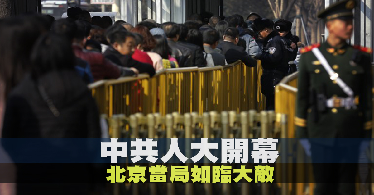 中共全國人大會議3月5號在北京人民大會堂開幕,周邊地區和天安門廣場等敏感地方戒備森嚴,街道路口都有戴紅袖標的人員值班,還有特警的車輛待命,進入北京都要查身份證,車輛也要安檢。到國家信訪局的訪民從平日的上萬人大幅減少到一、兩千人。