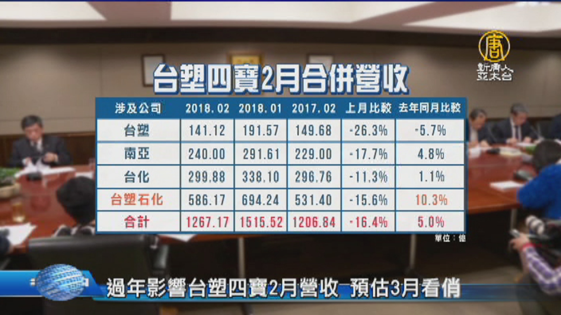 【新唐人亞太台 2018 年 03 月 06 日訊】台塑四寶今天(6日)公告2月營收,受到黃曆年假工作天數減少影響,四寶營收都較1月下滑,不過3月訂單暢旺,台塑四寶都樂觀看待,台化副董事長洪福源也指出,要注意存在的隱憂,像是油價震盪以及全球貿易戰,都將影響未來發展。