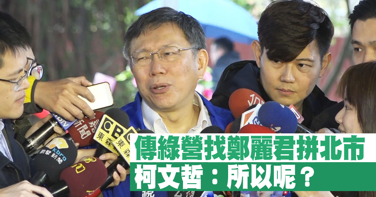 【新唐人亞太台 2018 年 03 月 08 日訊】外傳綠營有意在年底大選,找文化部長鄭麗君,以及前行政院長蘇貞昌,共同拼雙北選戰,擔心柯文哲,萬一選擇與國民黨合作,會讓民進黨流失雙北地盤。對此,台北市長柯文哲今天出席活動,也做出回應。