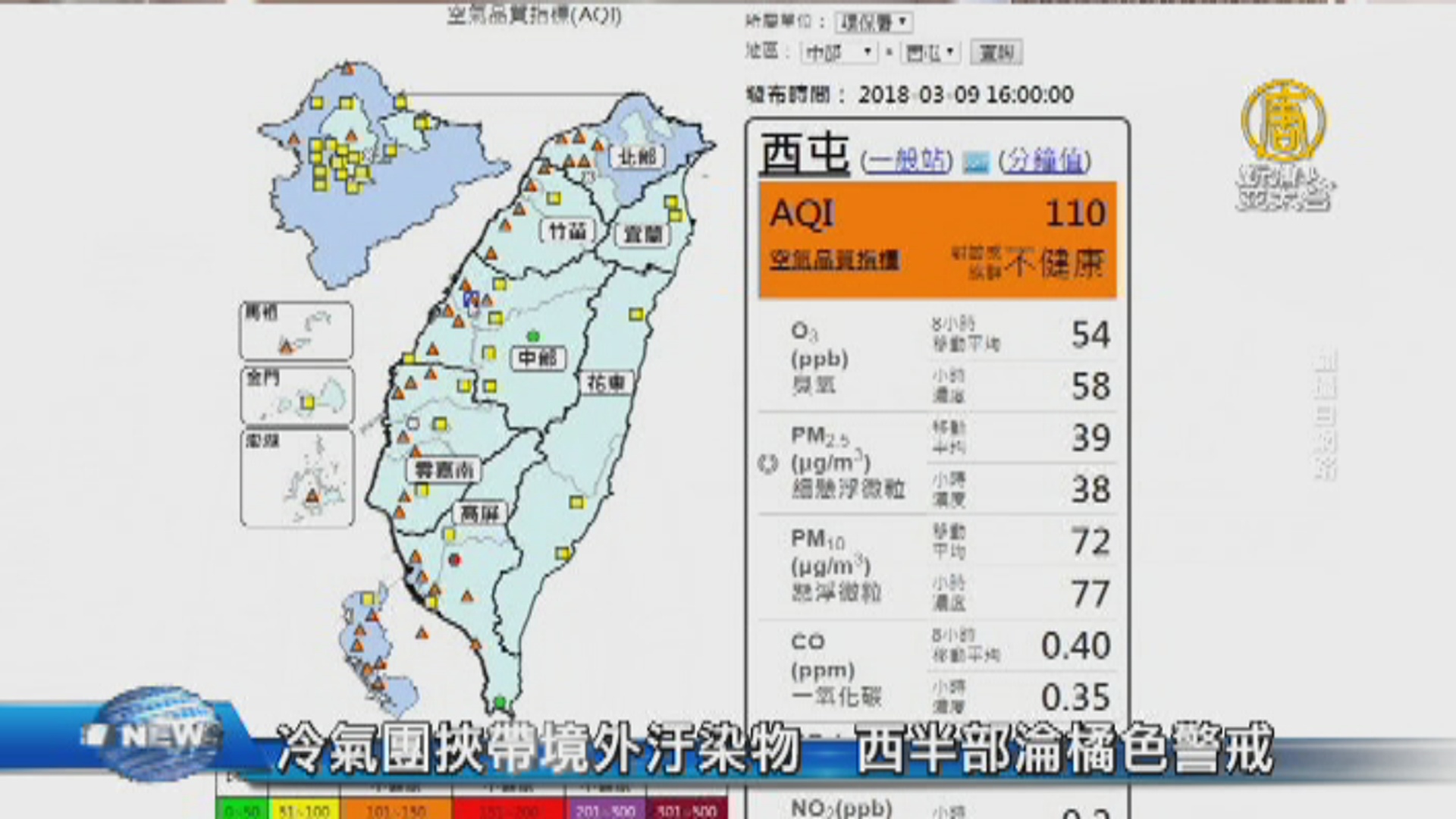 【新唐人亞太台 2018 年 03 月 09 日訊】新聞一開始,帶您關心天氣,這兩天受到大陸冷氣團影響,氣溫驟降。今天天氣轉乾冷,隨冷空氣侵台的境外汙染物,讓西半部空氣品質淪為對敏感族群不健康的橘色警戒,環保署警告,部份時段與區域,空氣品質會下降到紅色警戒。台電表示,在系統供電安全無虞下,已經進行自主降載減排。
